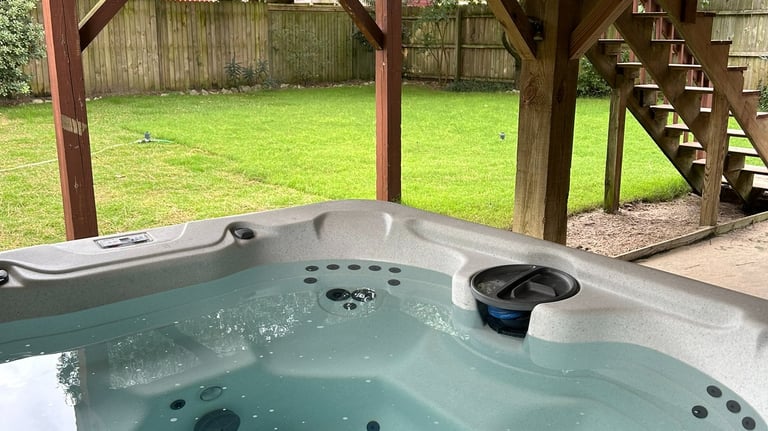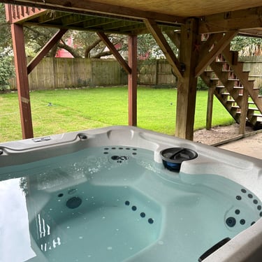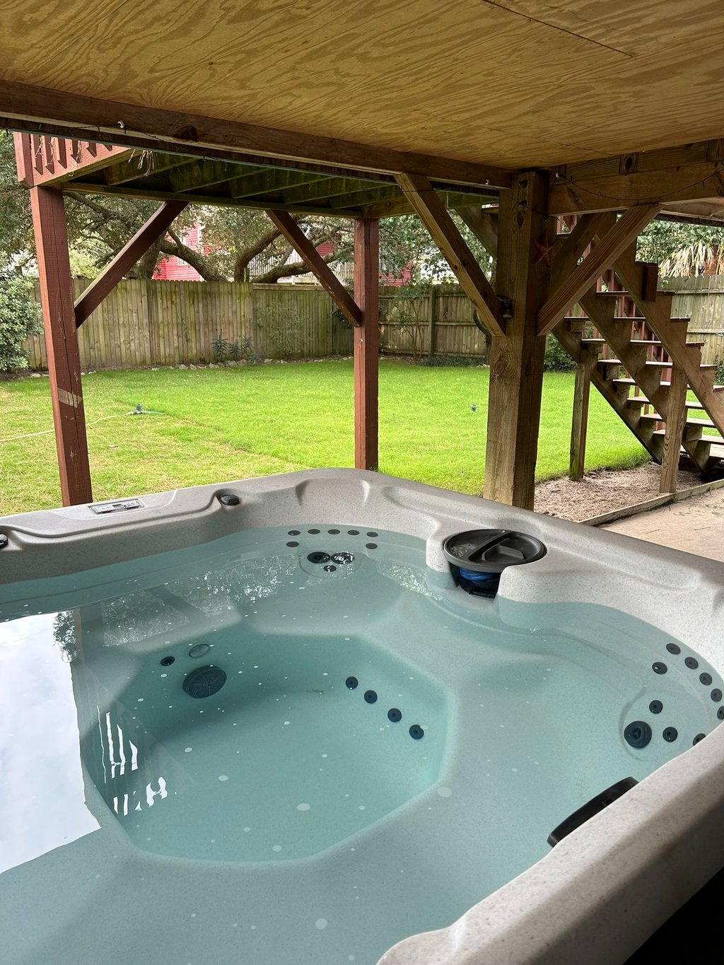 Relax in a 7-person hot tub after a day at the beach.